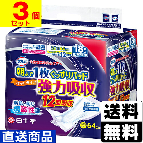 ■直送■[白十字]サルバ 朝まで1枚ぐっすりパッド 強力吸収 18枚入【1ケース(3個入)】同梱不可キャンセル不可