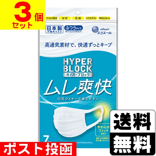 ■ポスト投函■[大王製紙]ハイパーブロックマスク ムレ爽快 ふつうサイズ 7枚入【3個セット】