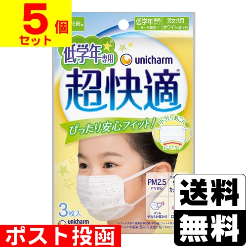 ■ポスト投函■[ユニチャーム]超快適マスク 低学年専用タイプ (柄付き) 3枚入【5個セット】