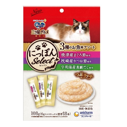 ■ポスト投函■[ユニ・チャーム]銀のスプーン三ツ星グルメ おやつ にっぽんSelect つぶリッチ 3種のお魚味アソート まぐろ節&かつお節&真鯛だし使用 108g【3個セット】